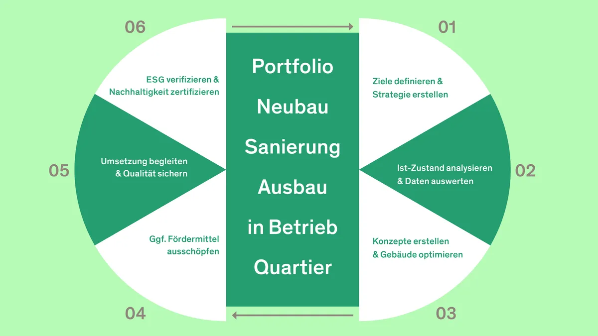 Unsere Leistungen beginnen bei ersten Analysen und Konzepten und reichen bis hin zur Zertifizierung nachhaltiger und ESG-konformer Immobilien und Quartiere.